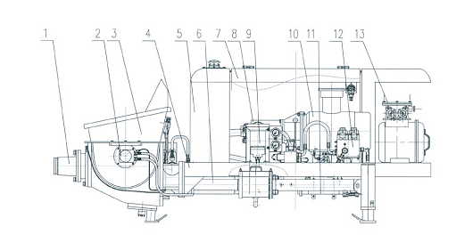 1.出料口 2.攪拌機構(gòu) 3.料斗 4.機架 5.液壓油箱 6.泵送系統(tǒng) 7.機罩總成 8.潤滑系統(tǒng) 9.動力系統(tǒng) 10.防暴電動機 11.液壓系統(tǒng) 12.水冷卻部件 13.電器總成